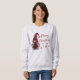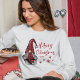 Rustikaler Landurlaub Frauenpullover mit "Frohe Weihnachten" und das Jahr in stilvoller roter Kalligraphie-Schrift. Dieses einzigartige Design besticht durch eine Dame Gnome in ihrem karierten, roten Büffel-Outfit mit Hut und mit Snowflake-Stars.