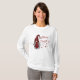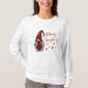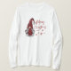 Rustikales Shirt im Landhausstil für Frauen mit langen Ärmeln mit "Frohe Weihnachten" und dem Jahr in stilvoller roter Kalligraphie-Schrift. Dieses einzigartige Design besticht durch eine Dame Gnome in ihrem karierten, roten Büffel-Outfit mit Hut und mit Snowflake-Stars.