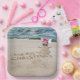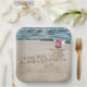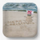 Niedlicher Sandschneemann mit fröhlichem Weihnachtsgeschmack, Sonnenbrille und gestreiftem Strumpf am Strand.