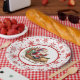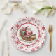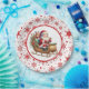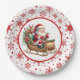 Eine schöne Weihnachtsplatte in roten Schneeflocken und ein glücklicher Weihnachtsmann in seinem Schlitten