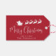 Feierliche Feiertage rote Geschenketiketten mit einer weißen Silhouette von Rentieren, die den Schlitten des Weihnachtsmannes fliegen, "Frohe Weihnachten" in einem stilvollen weißen Drehbuch und Ihren Namen in schlichter moderner Weißtypografie.