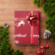 Moderne Weihnachtsgeschenkverpackung für Kinder, mit einem Einhorn (mit Mähne und Male mit rotem und goldenem Glitzer), das den Schlitten des Weihnachtsmannes zieht, dem Gruß "Frohe Weihnachten" in stilvoller Typografie und einem personalisierten Namen. Auf einem Weihnachtsrot.