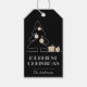 Die Wörter Frohe Weihnachten in Retro-Vintage Schrift, ein weißer Skizzenbaum mit Imitaten goldenen Folienschmuck und Geschenke sind auf diesen schwarzen Geschenketiketten personalisiert mit Ihrem Familiennamen vorgestellt. Stilvoll für jeden Weihnachtsfeiertag oder als Geschenk. PASSENDE Artikel in unserem Geschäft.