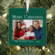 Moderne Weihnachtsbaumschmuck mit elegantem Stil. Diese phantastischen Urlaubsornamente bieten eine stilvolle typografische Begrüßung, die lautet: "Frohe Weihnachten, Ihr Familienname und das Jahr". Das individuelle Design zeichnet sich durch Ihr bevorzugtes Foto- oder Familienbild auf der Vorderseite aus, hervorgehoben durch einen einzigartigen, modernen Farbverlauf in Weiß auf einem schönen grünen Hintergrund. Auf der Rückseite des Ornaments befindet sich ein Textbereich für Ihre benutzerdefinierte Nachricht. Macht ein fantastisches Sake-Geschenk.
