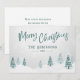Rustikale Landurlaubskarten mit "Frohe Weihnachten" in handgeschriebenem Stil, mit Ihrem personalisierten Familiennamen und dem Jahr, alles in Kieferngrün in Vintager Typografie. Ein wunderschöner landschaftlicher Blick auf Bäume und Winterschnee in Aquarellkunst hebt die Vorderseite der Karte hervor. Die Rückseite der Karte bietet Textfläche für Ihre persönliche Urlaubsnachricht oder kann für Sie leer verlassen werden, um bei Bedarf eine Handschrift zu schreiben. Erhältlich in hochwertigem gedrucktem Kartenmaterial für Standard-Mailings oder als digitales Format zum Herunterladen und schnellen und unkomplizierten Versenden per SMS, E-Mail oder sogar Selbstdruck.