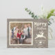 Schenken Sie herzliche Weihnachten wünscht diese Urlaubssaison mit unserer bräunlichen Foto-Flachkarte aus rustikalem Holz. Auf der links Seite des Designs befindet sich ein familiäres Foto, rechts steht "Frohe Weihnachten" über einem künstlerisch aufspringenden Rentier. Unter dem Reh befindet sich Ihr Familienname, ein trendiger Pfeil mit Herz und Jahr für Sie, um sich anzupassen. Das Foto hat ein quadratisches Seitenverhältnis, das am besten passt. Wechseln Sie mit Ihrem eigenen Foto zu einer personalisierten Karte, die Ihre Familie und Freunde lieben werden! Entworfen von Künstlerin © Susan Coffey. Fotografie © Storytree Studios, Stanford, CA.