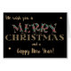 Eine schicke, aber lustige, textbasierte Weihnachtskarte mit "Wir wünschen Ihnen ein frohes Weihnachtsfest und ein glückliches Neues Jahr" in Gold- und Tartan-Schrift und zwei goldene Sterne auf schwarzem Hintergrund.