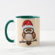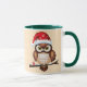 Dieses charmante Design zeigt eine detaillierte Darstellung einer braunen, weißen Eule, die auf einem Ast liegt. Die Eule trägt eine rote Weihnachtsmütze mit weißen Schneeflocken und fügt dem Festgeist hinzu. Seine köstlichen Augen ziehen die Aufmerksamkeit auf sich, während ein kleines rotes Geschenk mit weißem Band subtil am Fuß des Zweiges liegt, was die großzügige Natur der Partysaison nahe legt. Dieses Design erfasst die Hitze und die Weihnachtsfreude durch die Darstellung dieses Wintersymbolvogels im kosmischen und feierlichen Rahmen.