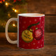 Erleben Sie Weihnachtsjubeln mit dieser festlichen Tasse, mit einem Cartoon von zwei Baum-Dekorationen oder Bausteinen auf einem Xmas-Zweig, einem glänzenden Gold, dem anderen glitzernden Rot. Verwenden Sie "Personalisieren Sie diese Vorlage", um die "Frohe Weihnachten! Und ein gutes neues Jahr!" Text, wenn gewünscht.