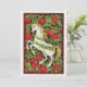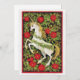 Malerei von Weihnachten Einhorn mit roten Poinsettia Blume und grüne Blätter auf einem dunklen Hintergrund. Auf der Rückseite ist eine poinsettia Blume mit grünen Blätter und die Inschrift Frohe Weihnachten.