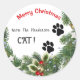 Weihnachts-Grüße vom Cat-Aufkleber/Umschlag Aufkleber für Urlaubskorrespondenz, Geschenkgutscheine, Karten und vieles mehr. Niedliche Pfotenabdrücke und Grünkranz auf dem klassischen Rundaufkleber. Kann bearbeitet werden, um Happy Holidays, oder die Grüße der Saison zu lesen.