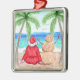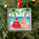 Weihnachtsschmuck mit dem Weihnachtsmann und einem Schneemann aus Sand, der auf einem Strand sitzt und die Ozeanwellen beobachtet. Niedlich für jemanden, der ein "Snowbird" ist oder in Florida, South Caroline, Texas oder einem der warmen Staaten oder Länder in Rente geht.