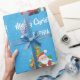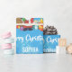 Moderne Weihnachtsgeschenkverpackung für Kinder, mit Weihnachtsbaum, vielen Geschenken, dem Gruß "Frohe Weihnachten" in stilvoller Typografie und einem personalisierten Namen. Auf blauem Hintergrund mit Schneeflocken.