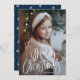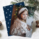 Niedliche Urlaubskarte mit "Frohe Weihnachten" am Ende der Karte in einem weißen handgeschriebenen Skript. Personalisieren Sie die skurrile Weihnachtskarte mit Ihrem vertikalen Foto und Familiennamen. Die Karte kehrt zu einem marinen und weißen Schneeflockenmuster zurück.