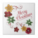 Diese festliche Weihnachtsfliese verfügt über ein hübsches Trio aus goldenen, roten und grünen Weihnachtsbildern, die oben links sind, und mehr ganz unten rechts. Die Blume sind mit roten Swirl-Designs geschmückt. Der dekorative Text an der Seite sagt "Frohe Weihnachten" in rot. Alles wird auf einem schneeweißen Hintergrund platziert. Hübsch für die Weihnachtszeit!