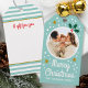 Machen Sie Ihre Urlaubsgeschenke mit individuellen Foto-Geschenketiketten besonders attraktiv! Diese festliche Vorlage ist mit einem beliebten Foto und Familiennamen auf der Vorderseite personalisiert, mit Platz auf der Rückseite für eine handgeschriebene Note. Ein Vintages Design mit einfachen Illustrationen von Heiligen Beeren, Schneeflocken und Sternen, sowie dem Gruß "Frohe Weihnachten" in Retroskripttypografie. Dieses spielerische Design bringt eine nostalgische Touch mit einer modernen Drehung und ist perfekt für Kinder, Familien und Freunde! Druckfarben: Minze, blau-grün, rot, grün, weiß und gold.