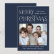 Moderne blaue Urlaubskarte mit "Frohe Weihnachten" in Vintager Typografie, "Happy New Year" und einem saisonalen Gruß in eleganter weißer Typografie, Ihrem Foto und Ihrem Namen.