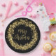Die Teller der Feiertagszeitung sind mit glänzenden goldenen Sternen, Kreise und Punkten versehen, die auf schwarzem Hintergrund die Worte "Frohe Weihnachten" umkreisen. PASSENDE Artikel in unserer Sammlung.