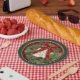 Schönes, originelles handgemaltes Kunstwerk und grafisches Design von Audrey Jeanne Roberts hat ein elegant handgebundenes rotes Samt mit goldgekracktem, kiefernem Bug in einer frischen Fichte und Kiefernkranz. Zaubersterne funkeln über das Plattendesign und das Set des handgeschriebenen Schriftzeichen "Frohe Weihnachten" aus dem Glitzer in den klassischen Weihnachtsfarben Rot, Grün und Gold-Glitzer. Fügen Sie die passenden Servietten hinzu, und dieses dekorative Set wird für einen festlichen Anlass zu jedem Weihnachtsfest, Business Corporate Event oder Familienfeier, die Sie veranstalten können, sorgen. Ihr Familienname, Ihr Firmenname oder Ihre Nachricht werden mit dem vorgegebenen Vorlagenfeld problemlos ausgetauscht.