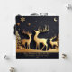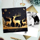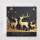 Freuen Sie sich auf ein schönes Trio von Rentieren, die auf Hügeln im Wald stehend sind und den Himmel mit Schneeflocken und Mond betrachten. Fotovorlage auf der Rückseite und Vorlagen auf der Vorderseite begrüßen. Schwarzer Hintergrund.