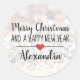Eleganter "Frohe Weihnachten und ein glückliches Neues Jahr" runder Stock mit einem schwarzen Schriftart auf einem silbernen Glitzer Hintergrund, geschmückt durch ein niedliches rotes Herz. Text anpassen.
