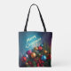 Mittlere Weihnachtskiste mit individuellem Text. Farbenfrohe Dekoration auf tiefblauem Hintergrund. Personalisieren Sie diese Tasche mit Ihrem eigenen Text.