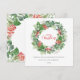 Ein wunderschöner Weihnachtskranz mit grünen Blätter, Eukalyptus, Heiligen und Rotbeeren, mit den Worten Frohe Weihnachten in eleganter roter Typografie. Passen Sie Ihre persönlichen Daten an.