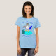 Dieses Shirt ist mit einem niedlichen, kleinen, grauen und weißen Pinguin mit schwarzen, bunten Augen und gelben Schnabel und Füßen ausgestattet. Der Pinguin hält einen großen blauen Fisch mit einem Flossen und stehend auf einem blassblauen Eisklumpen. Neben dem Pinguin gibt es ein offenes Geschenk mit festlichem Band.