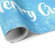Moderne Weihnachtsgeschenkpackung mit den Worten "Frohe Weihnachten" in stilvoller Typografie, Schneeflocken, eine Illustration eines Einhorns (mit einem Mann und Schwanz mit rotem und goldenem Glitzer), das den Weihnachtsmann in seinem Schlitten zieht, und eines Weihnachtsbaumes. Auf blauem Hintergrund mit Schneeflocken. Beachten Sie, dass Sie den kleinen Gruß mit dem Namen eines Kindes personalisieren können.