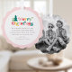 Weihnachtsschmuckkarte mit dem Text "Frohe Weihnachten" in farbenfroher Retro-Typografie und einem hellrosa Rahmen. Anpassbares Foto auf der Rückseite.