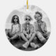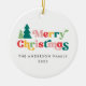 Rundschmuck mit dem Text "Frohe Weihnachten" in farbenfroher Retro-Schriftart und individualisierbarem Familiennamen und Jahr. Auf der Rückseite ist eine Vorlage für Ihr benutzerdefiniertes Foto.