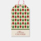 Elegante Weihnachtsgeschenke, die ein Weihnachtsbaummuster zeigen und den Text "Frohe Weihnachten", der personalisiert sein kann. Die Gestaltung ist in Rot, Grün und Beige gehalten. Dieses Geschenktag ist ideal für Ihre Weihnachtsgeschenke in dieser Saison.
