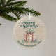 Beige Imitate prallen als Hintergrund, grüner Text. Frohe Weihnachten ist mit einem Retro-Schriftart geschrieben. Dekoriert mit einer Weihnachtszeit-Geschenkboxen mit Kiefernästen. Personalisieren und fügen Sie Ihren Familiennamen und ein Jahr. Ein Einbruchbild, kein echter Stoff.