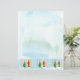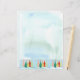 Fröhliches Weihnachtspapier für Urlaubssbriefe mit Vintag inspiriertem Design mit schneebedeckten Urlaubsprofilen in sanften Smaragdtönen, Wattestönchen pink, goldgelb und mehr mit einem frostig blauen Aquarellhintergrund.