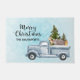 Herzlich willkommen an der Tür mit festlichem Urlaubsstil. Ein LKW, der Weihnachtskiefern mit einigen Waldtieren trägt. Ein Bär, ein Fuchs und ein Hirsch, der im Rücken stehend ist, um eine Fahrt zu machen. Design erstellt mit Aquarellfarben. Im Text steht frohe Weihnachten mit deinem personalisierten Namen.