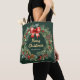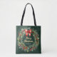 Eine festliche Weihnachtstotentasche mit traditionellem Kranz-Design mit Pinecones, heiligen Beeren und einem roten Bogen auf tiefgrünem Hintergrund. Das Bebag eignet sich ideal, um während der Ferienzeit das Wesentliche zu tragen, ob Sie nun Geschenke kaufen, Ansammlungen besuchen oder Freunde zum Kaffee treffen. Es ist auch eine stilvolle wiederverwendbare Alternative zu Papiergeschenktaschen. Personalisieren Sie mit einem Namen für die Touch.