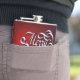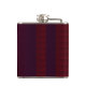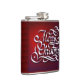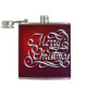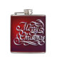 Ein angesagter Edelstahl-Kolben mit rotem Gradientenhintergrund, der die Worte "Frohe Weihnachten" in einem eleganten, fließenden weißen Drehbuch enthält. Der Kolben hat eine silberne Kappe und ein Scharnier, und das Gesamtbild ist festlich und modern.