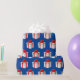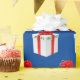 Weiße Geschenkboxen mit rotem Bogen und froher Weihnachtstext auf blauem Hintergrund. Die Hintergrundfarbe kann geändert werden.