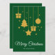 Frohe Weihnachten in einem extravaganten kalligraphischen Schriftart mit hängenden Weihnachtsbaum, Geschenke, Stern und Weihnachtsbaumdesign. Diese grüne Hintergrundfarbe Weihnachtskarte ist so konzipiert, dass Sie die Farbe des Hintergrunds ändern können und auch Ihren Familiennamen eingeben oder entfernen können, wenn Sie nur das Design ohne Nachname haben möchten.