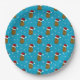 Wiederholtes Muster brauner Weihnachtskartoffeln mit hellroten Weihnachtsmannmützen. Ein blauer Hintergrund voller glitzernder weißer Schneeflocken.