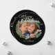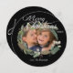 Runde Weihnachtsferien Fotokarte mit einem Kranz aus Grün und Kiefern, ein Bereich, den Sie leicht hinzufügen können, ein Foto, weiße Text, der frohe Weihnachten, und einen Bereich, den Sie können Ihren Namen und das aktuelle Jahr vor. Die Rückseite der Karte ist schwarz mit extravagantem weißen Text, der Happy Holidays mit ein paar Schneeflocken liest. Fotografie © Storytree Studios, Stanford, CA