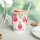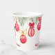 Rote und goldene Weihnachtsbaumschmuck und Kiefernäste und die Worte Frohe Weihnachten (oder irgendeinen Text) auf Elfenbeinhintergrund, diese Papiertassen sind ideal für jeden Weihnachtsfeiertag.