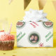 Frohe Weihnachts-Schneeflocke personalisierte Fotomaterial Papier oder Geschenkpackung mit zwei Fotos Ihrer Familie in einem runden Platzhalter mit Rändern, roten Schneeflocken, dem Text "Frohe Weihnachten" und Ihrem Namen.
