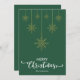 Grün frohe Weihnachten mit extravagantem Dekorationsskript und hängendem goldenen Schneeflocken-Design. Diese grüne Hintergrundfarbe Weihnachtskarte ist so konzipiert, dass Sie die Farbe des Hintergrunds ändern können. Sie können auch Ihren Familiennamen eingeben oder entfernen, wenn Sie nur das Design ohne Text haben möchten. Sie können auch die Farbe der Worte "Frohe Weihnachten" anpassen, indem Sie dieses Design, wenn Sie möchten.