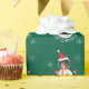 Fantastisches und niedliches Weihnachtspapier mit maßgeschneidertem Foto als Schneemann, Schneeflocken auf festlich grünem Hintergrund. Unter dem Schneemann steht frohe Weihnachten mit weißer festlicher Typografie geschrieben.