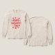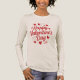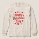 Dies ist ein beiges T-Shirt mit langen Ärmeln und Text mit Frohen Valentinstag mit süßen roten Herzen um den Text herum.