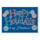 Eine lustige, textbasierte Happy Holidays Card für einen Friseur mit Ornamenten und Lettern, mit roten, blauen und grünen Chevronen und Polka-Punkten gefüllt, Kontur in Weiß auf einem hellblauen Hintergrund. Für den Fall, dass Sie keine Karte für den gewünschten Empfänger finden können, gibt es auch eine benutzerdefinierte Vorderkarte mit diesem Design.