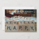 Brettspiel mit den Worten "Happy New Year" auf den hölzernen Blockplätzen. Ändern Sie den Namen und die Nachricht für Ihre eigene. Fun Card hat das gleiche Wortspiel auf der Kartenbank. Obwohl etwas anders als auf der Vorderseite gezeigt.