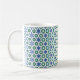 Diese fröhliche Tasse zeichnet sich durch ein leuchtend progressives Muster in Blau, Gelb und Grün aus. Die lebhaften Farbmuster umwickeln die Tasse und geben Ihnen interessante Motive, um sich mit Ihrem Getränk zu verwöhnen. Zu den Motiven zählen sechsblättrige Blume, Sterne, Diamanten und Honigwaben.