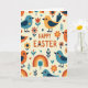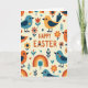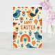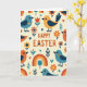 Diese Grußkarte zeigt die Nachricht „HAPPY EASTER“ zentriert nahe dem oberen Rand in warmen orangen Buchstaben, wobei ein kleines Herz als Punktdetail verwendet wird, was der Formulierung eine sanfte, liebevolle Note verleiht. Auf einem cremefarbenen Hintergrund wiederholen sich stilisierte Vögel in einem ordentlichen Muster, gefärbt in Türkis, Orange und Goldgelb mit dunkelblauen Flügeln und einfachen schwarzen Augen. Einige Vögel tragen winzige Herzmarkierungen auf ihrer Brust, wie kleine Tokens, die unter Freunden geteilt werden 🐰. Um sie herum sitzen vereinfachte Blumen in Orange und Rot neben kleinen blättrigen Zweigen, verstreuten Herzen und weichen, geschwungenen Regenbögen in gedämpften Primärfarben. Die flachen Formen und einfarbigen Flächen halten alles ordentlich und modern, während die wiederholten Motive wie ein freundlicher Chor über die Seite wirken 🐇. Der Text bleibt klar vom Muster getrennt und sticht im offenen Raum über den Vögeln und Botan